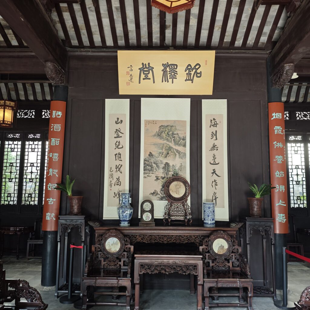 这是铭泽堂(maybe我猜的)是主要会客厅。说实话跟我老家也差不多的感觉。看样子古时候都一样。不过比较特别的是,这个地方没有拦起来,可以坐进去。那估计也都是后来仿的。我也去做了下,屁股铬得慌,还是要搞个垫子。