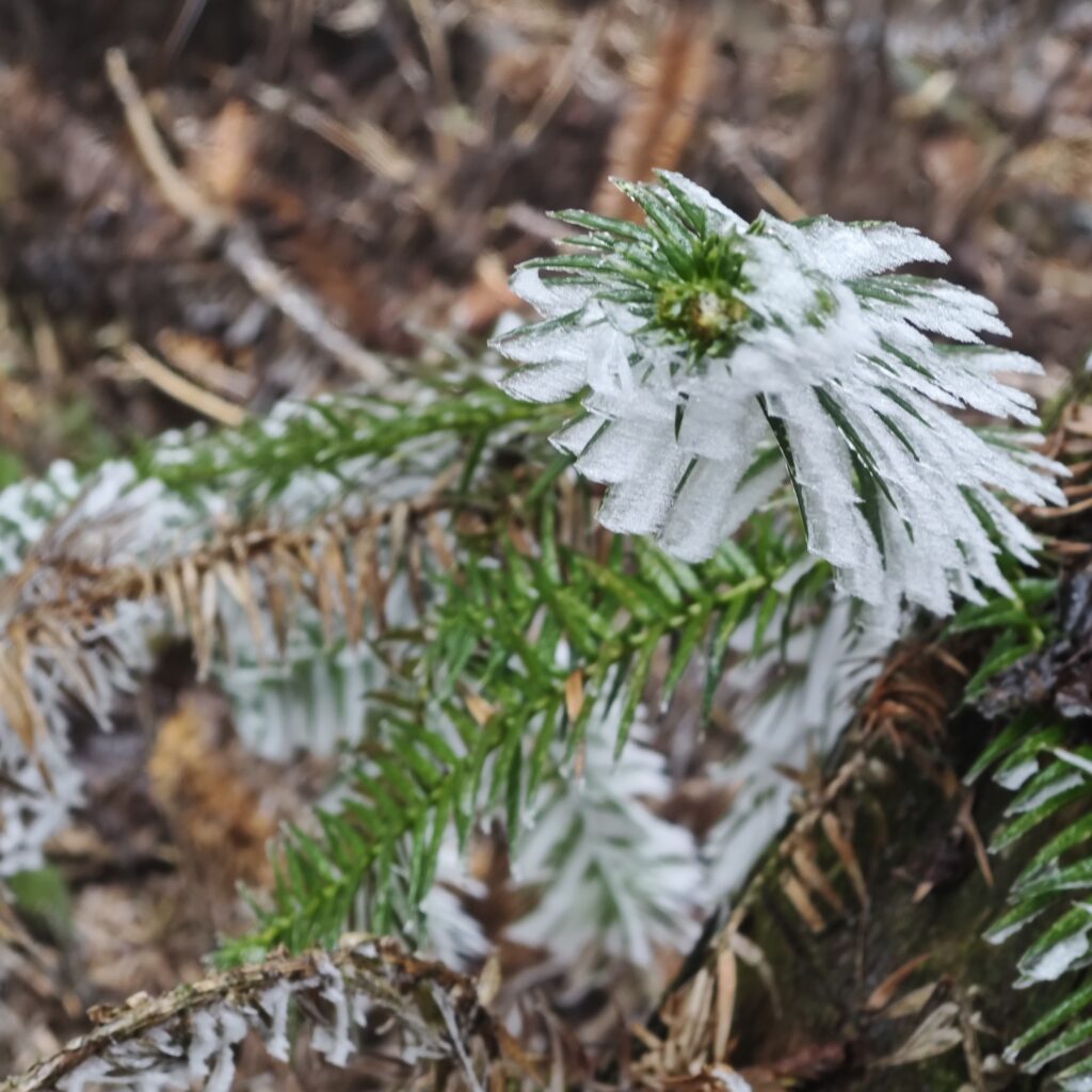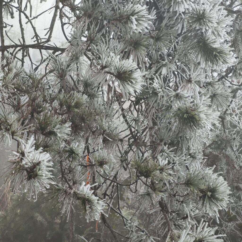 下山的路更是可怕。这一路是雾凇。好看非常,但是有树的地方,路上就有碎冰,又是下坡路,一步一个趔趄。